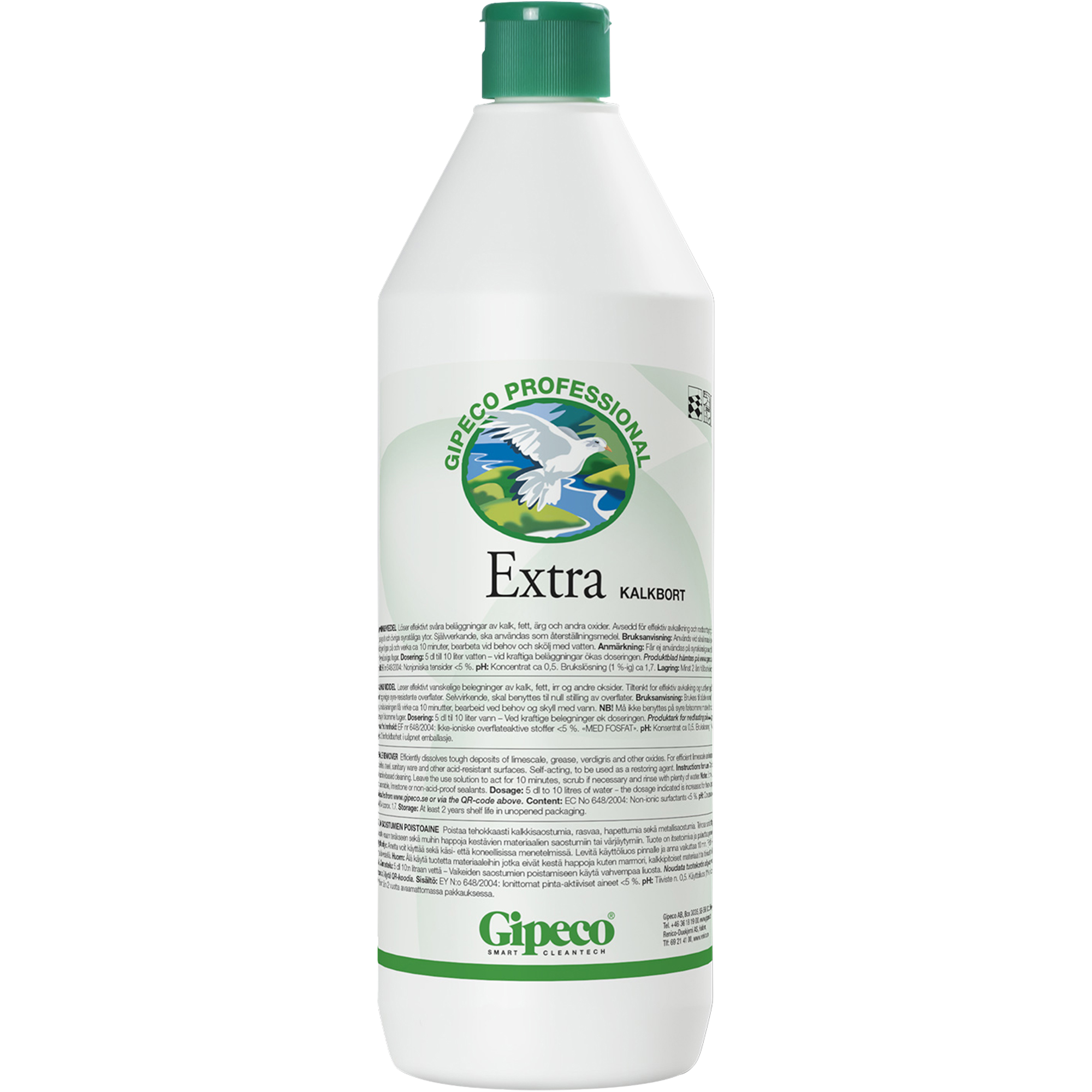 GIPECO Kalkbort Extra är ett avkalkningsmedel avsett för effektiv avkalkning och rostborttagning på kakel, klinker, rostfritt, sanitetsporslin och övriga ytor som tål syror. Lämpligt till avkalknings- och avrostningsbad.