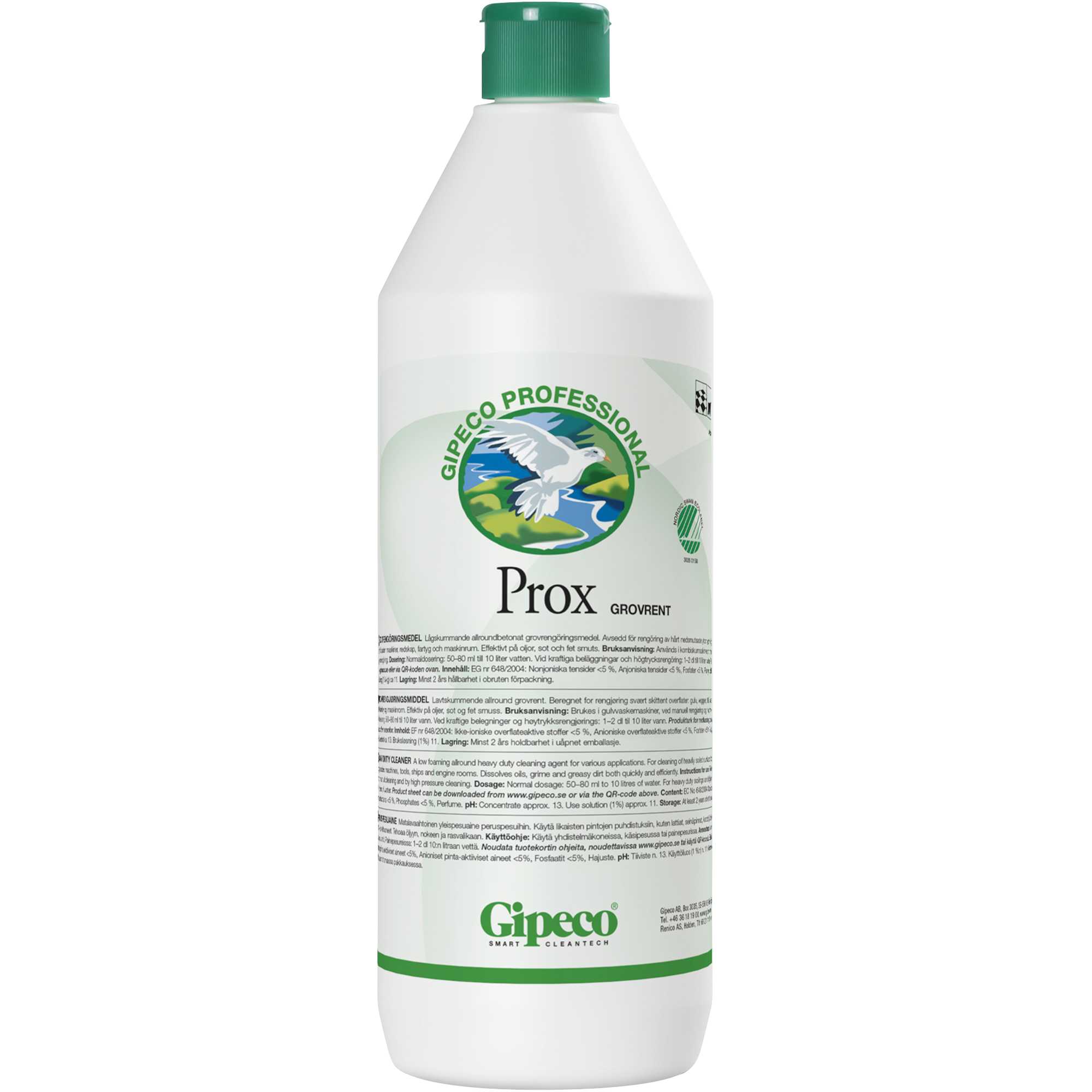 Gipeco Prox är ett lågskummande grovrengöringsmedel avsedd för rengöring av hårt nedsmutsade ytor som t ex verkstaden eller garagets golv, väggar och tak, fastighetsfasader, maskiner, redskap, fartyg och maskinrum. Gipeco Prox löser snabbt och effektivt fet smuts, oljor, sot, fett och föroreningar från animalier och vegetabilier samt vissa färger som används i tryckerier. Mycket lämplig vid storstädning, flyttstädning, rengöring av verkstäder eller livsmedels-/djurindustrier.